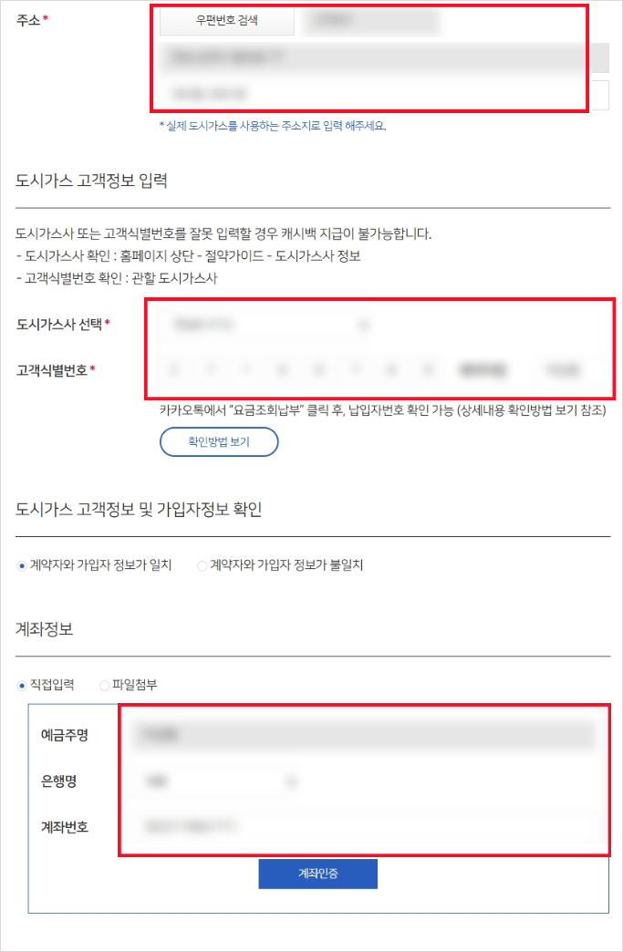제가 직접 신청을 해봤는데요? 빨간 네모의 사항들을 입력한 후 계좌인증까지 마치면 회원가입과 동시에 캐시백 신청이 완료되더라구요! 아참 고객식별번호는 도시가스사 선택하면 나와요!