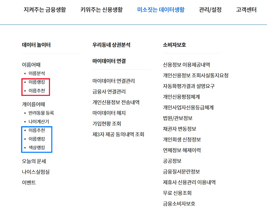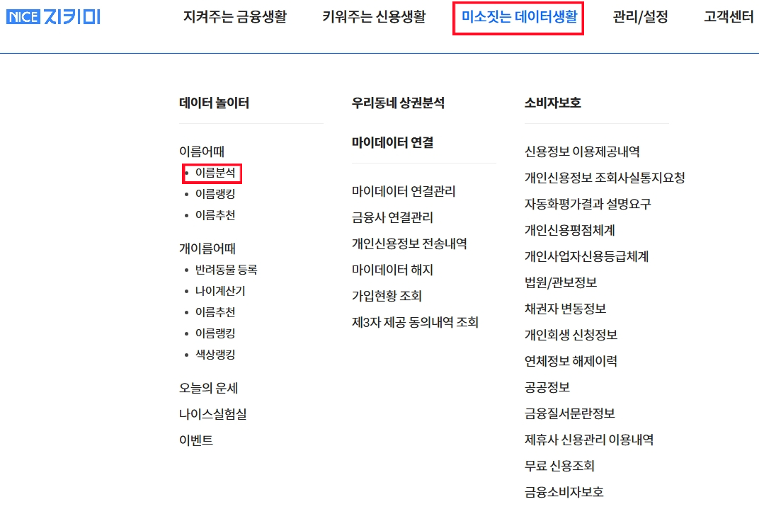 로그인 후 상단메뉴 미소짓는 데이터 생활 > 데이터 놀이터 > 이름어때 > 이름 분석 으로 들어가주세요. 이름 검색하는 페이지가 나오면 궁금한 이름을 입력한 후 이름분석을 눌러주시면 이름분석 결과가 나오게 됩니다.
