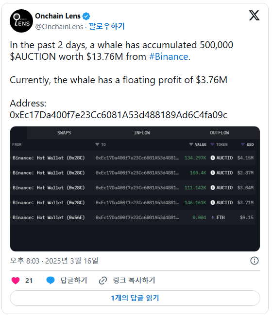 Onchain Lens는 유명한 암호화폐 애널리스트인데요. 그 사람 정보에 따르면 고래투자자가 약 200억 원어치를 매집했다고 해요. 추세를 만들기에는 충분한 금액인 거 같아요.