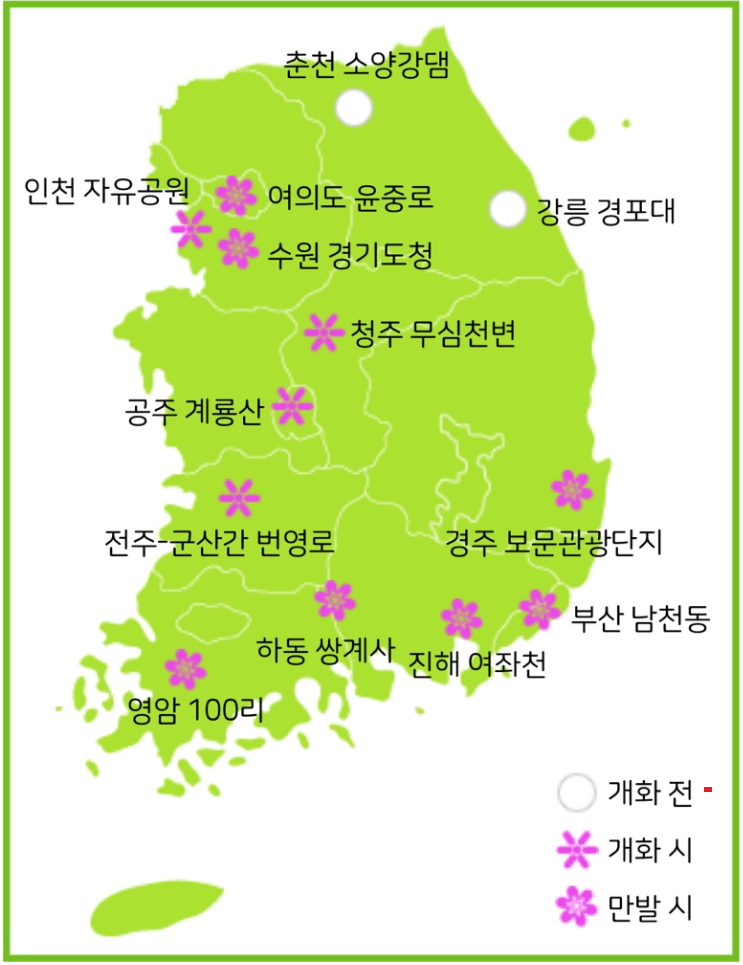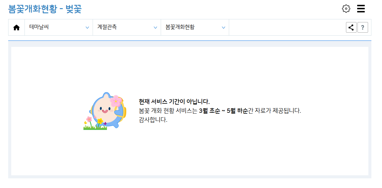 개화정보를 보시려면 기상청 날씨누리에 접속하시면 되는 데요 현재는 서비스 기간이 아니고 이제 3월이니 곧 정보가 제공될 예정이예요. 저는 매년 요긴하게 쓰고있답니다. 참고로 가을에는 단풍현황도 보여준답니다?