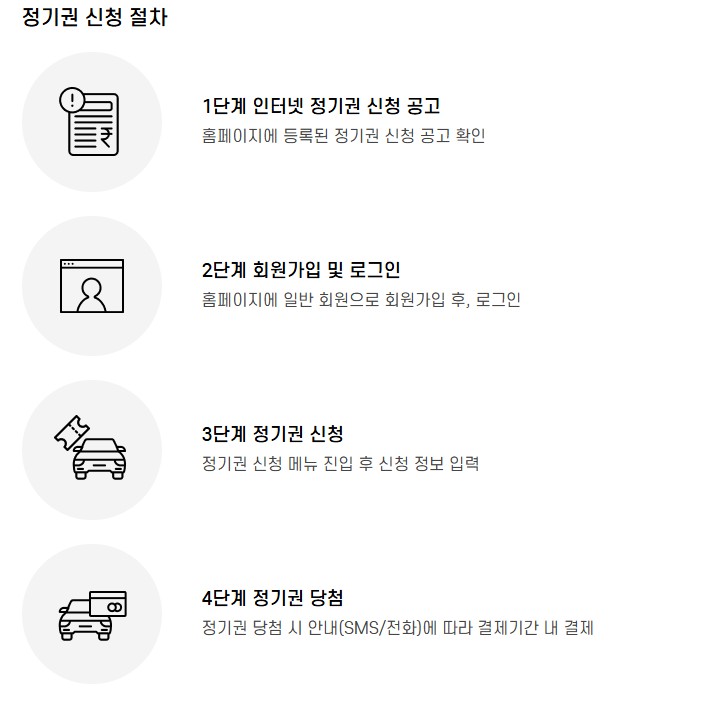 정기권 신청 절차는 아래 사진과 같은데요. 매번 정기권 자리가 있는 것이 아니기 때문에 정기권 공고를 확인하시고 신청을 을 하셔야 해요. 공고글 보는 게시판 남겨드릴게요.