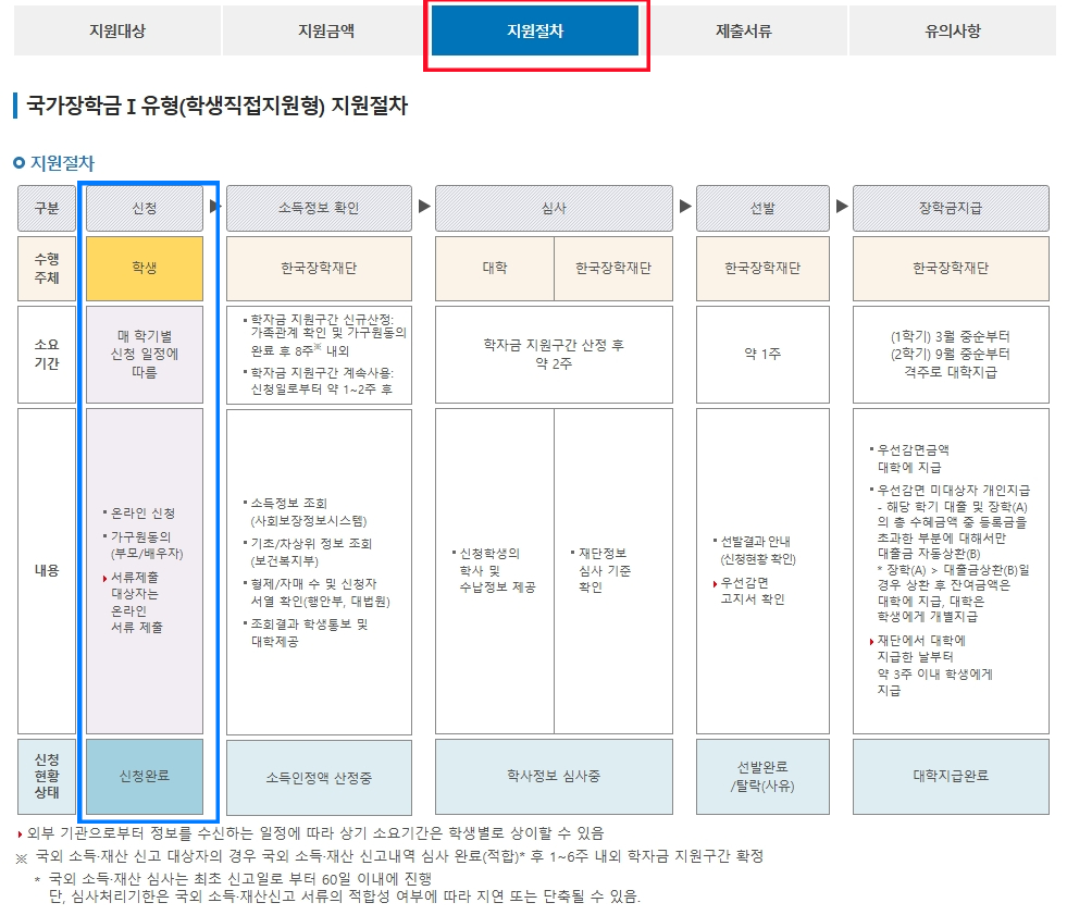 신청 -> 소득정보 확인 -> 심사 -> 선발 -> 장학금 지급